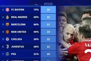 体育资讯03月19日讯 欧冠八强已经全部产生,德转统计了各球队自1994/95赛季起参加欧冠1/4决赛的次数,其中,拜仁、皇马、巴萨位居前三,曼联第四。